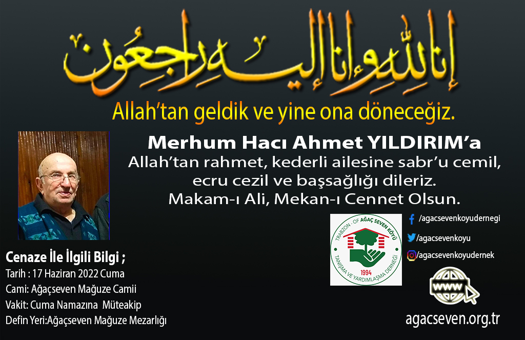 Köyümüz Hemşehrilerimizden ,Merhum Hacı Ömer oğlu Mehmet ve Sabri Yıldırımın babaları ; Hacı Ahmet YILDIRIM 16/06/2022 Perşembe günü Ağaçseven Mahallemizde “Rahmet-i Rahmana” kavuşmuştur.