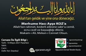 Merhum Hüseyin Koz’un değerli eşi Hacı Ayşe Koz Ankara’da vefat etmiştir. Merhumenin cenazesi 10 Mayıs 2021 tarihinde İstanbul’a götürelerek defnedilecektir. Merhumeye Allahtan rahmet dileriz.
