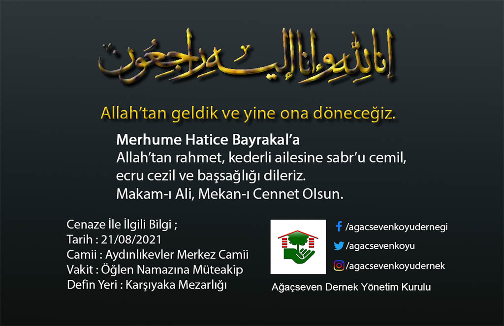 Hızır Üzümcü kızı Yusuf Bayrakal eşi Hatice Bayrakal hakkın rahmetine kavuşmuştur. Merhum Hatice Bayrakal’a Allah’tan rahmet geride kalan kederli ailesine başsağlığı dileriz.