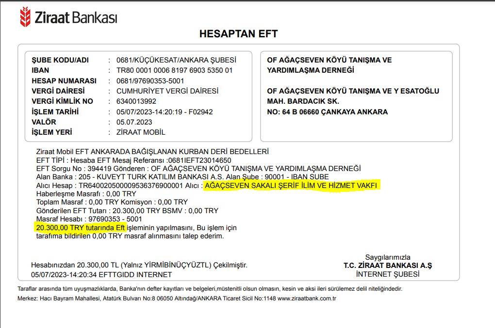 26 Haziran 2023 tarihinde web sayfamız ile sosyal medya hesaplarımızda paylaştığımız “Kurban Derilerimizi Ağaçseven Kuran Kursumuz İçin Topluyoruz!” başlıklı haberimiz ile Ankara Küçükesat Dernek Merkezimiz ile Aydınlıkevler Dernek şubemizde toplanan deriler görevli arkadaşlarımızın çalışmaları ile toplanmış ve değerlendirilmiştir.Kurban derilerinden elde edilen 20.300 TL gelir, Ağaçseven Mahallemiz Erkek Kuran Kursunda Allahın Kelamı Hz.Kuran-ı Kerim öğretmek ve hafızlık eğitimi alan çocuklarımızın iaşe ve ibade ihtiyaçlarını gidermek amacıyla derneğimiz banka hesabı üzerinden kuran kursumuz hesabına gönderilmiştir.Allah katkı sağlayan hemşehrilerimizin kurban ibadetlerini kabul ve makbul eylesin. Dernek yönetimizimizn şeffaf yönetim anlayışı ile ödeme dekontumuzu aşağıda siz değerli hemşehrilerimizin bilgisine sunuyoruz.