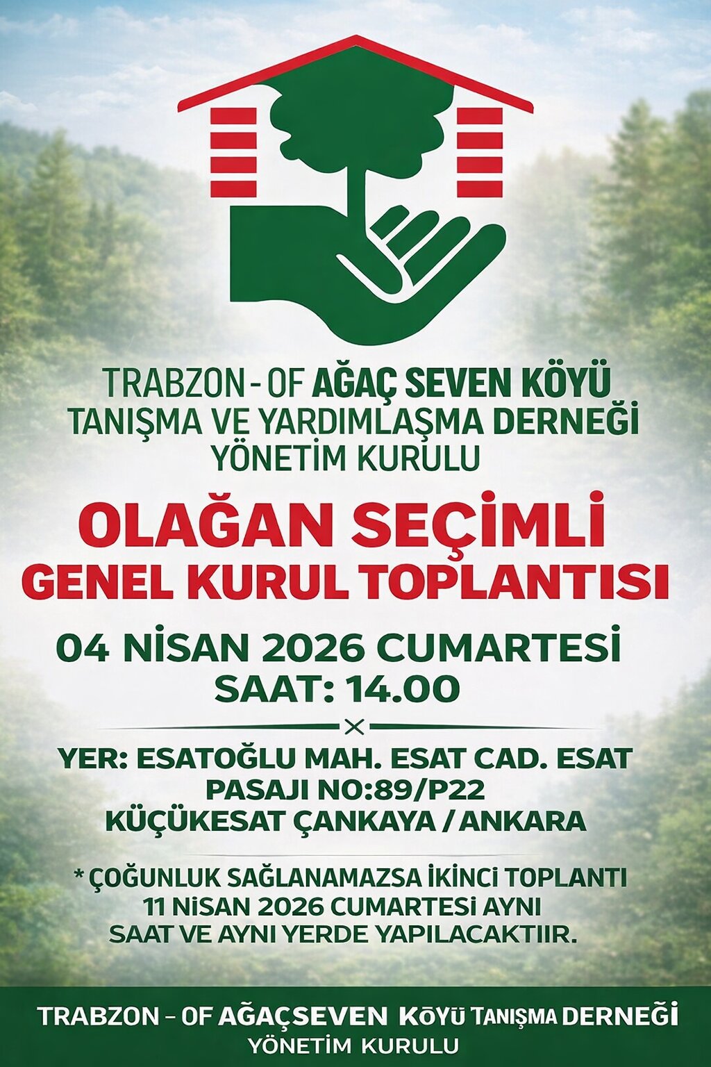 Ağaçseven Köyü Tanışma ve Yardımlaşma Derneği Yönetim Kurulu’nun almış olduğu karar doğrultusunda, Derneğimizin Olağan Seçimli Genel Kurul Toplantısı aşağıda belirtilen gündem maddelerini görüşmek üzere 04 Nisan 2026 Cumartesi günü saat 14.00’te aşağıdaki adreste yapılacaktır.